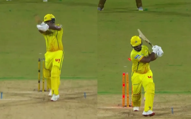 IPL 2026: KKR’s Kartik Tyagi knocks Sanju Samson’s stumps after being hit for massive six (image via X)